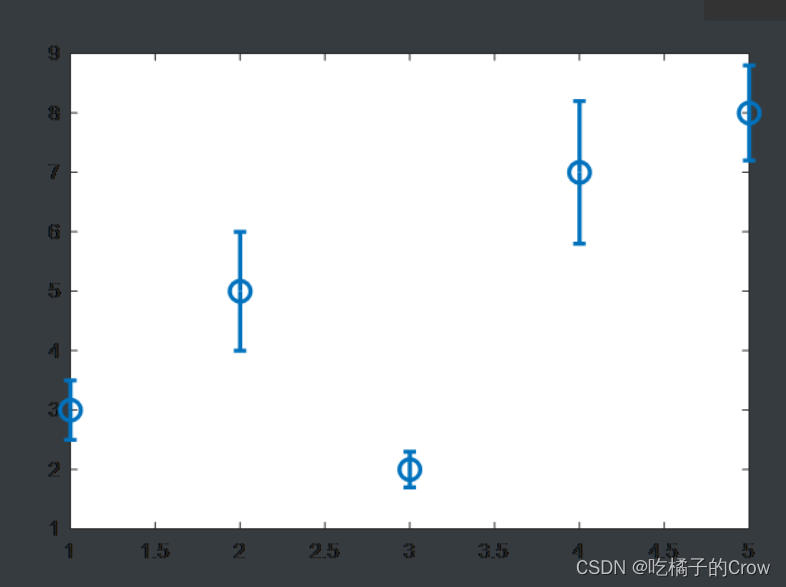 >> x=1:5;>> y=[3 5 2 7 8];>> e=[0.5 1 0.3 1.2 0.8];>> errorbar(x,y,e,'o','MarkerSize',10,'LineWidth',2);