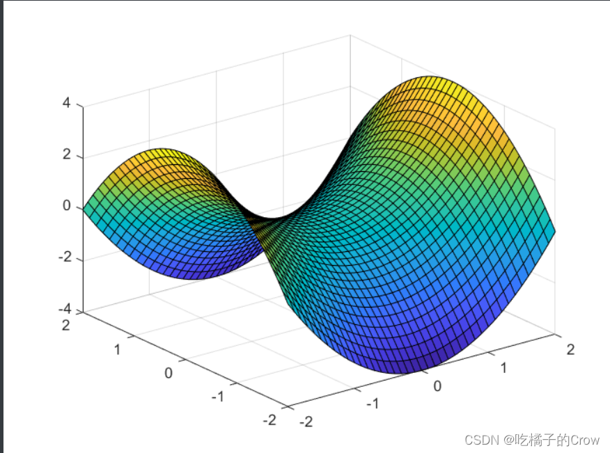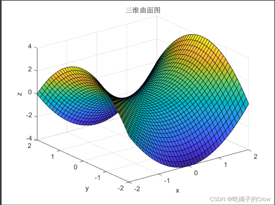 >> %生成数据>> %meshgrid函数可以用于生成二维网格矩阵,从而方便地生成网格图或三维图形>> [X,Y]=meshgrid(-2:0.1:2);%相当于生成区间>> %三维表达式>> Z=X.^2-Y.^2;>> %surf方法绘制三维曲面图>> surf(X,Y,Z);>> xlabel('x');>> ylabel('y');>> zlabel('z');>> title('三维曲面图');