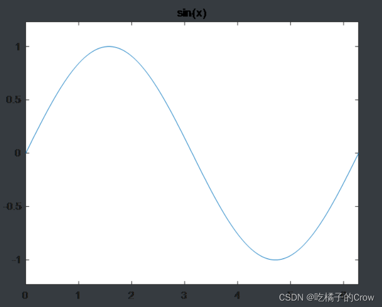 >> x=0:0.01:2*pi;//设置x区间步长>> y=sin(x);//设置需要画图的函数>> plot(x,y);//画图>> xlabel("x轴");//设置x轴名称>> ylabel("y轴");//设置y轴名称>> title("sin(x)")//设置标题