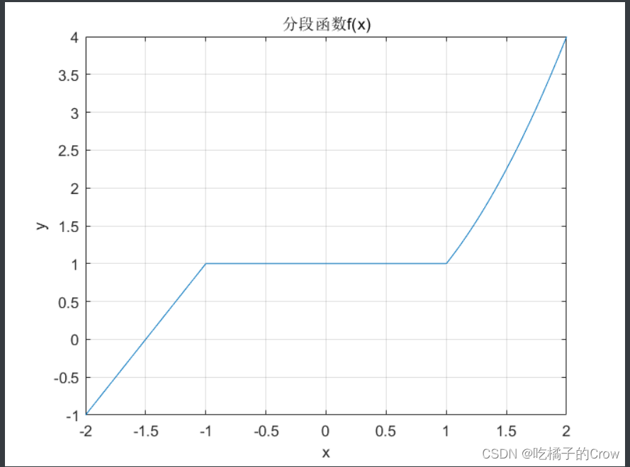 >> %定义分度函数>> f=@(x)(x>1).*x.^2+(-1<=x&x<1).*1+(x<=-1).*(3+2*x);>> %生成x向量>> x=linspace(-2,2,1000);>> %计算y向量>> y=f(x);>> %绘制函数曲线>> plot(x,y)//设置网格曲线>> grid on%x坐标名称>> xlabel('x')#y坐标名称>> ylabel('y')%题目>>title('分段函数f(x)')legend('表达式1','表达式2')