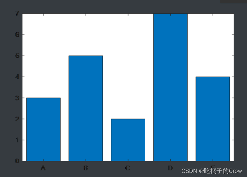 >> x=categorical({'A','B','C','D','E'});>> y=[3 5 2 7 4];>> bar(x,y)