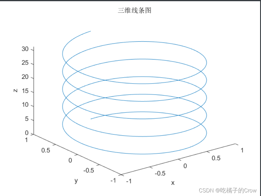 >> %生成数据>> t=linspace(0,10*pi,1000);>> x=sin(t);>> y=cos(t);>> z=t;>> %绘制三维线条图>> plot3(x,y,z);>> xlabel('x');>> ylabel('y');>> zlabel('z');>> title('三维线条图');