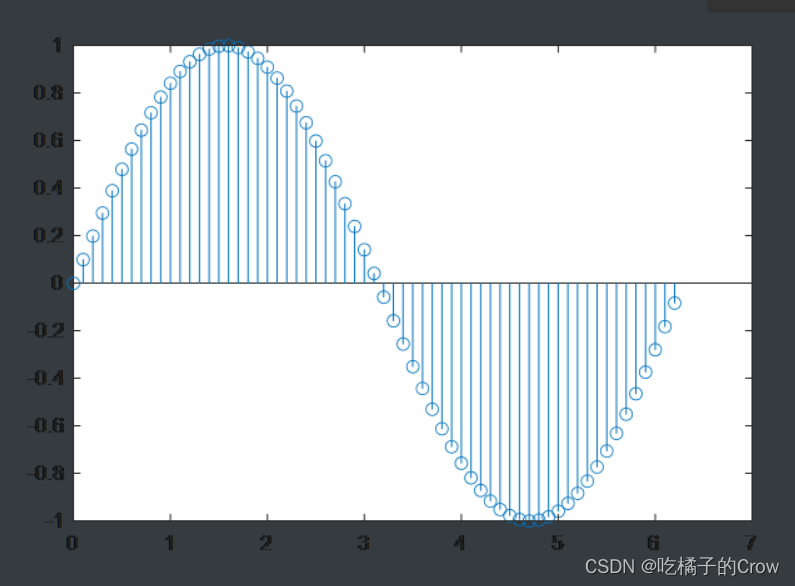 >> x=0:0.1:2*pi;>> y=sin(x);>> stem(x,y);