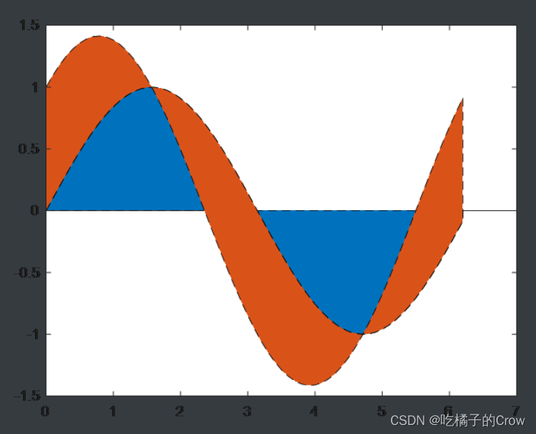 x=0:0.1:2*pi;>> y1=sin(x);>> y2=cos(x);>> area(x,[y1:y2]','LineStyle','--')