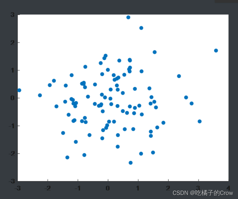 x=randn(1,100);>> y=randn(1,100);>> scatter(x,y,"filled")