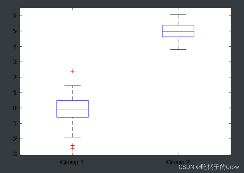 >> x=[randn(100,1);5+0.5*randn(50,1)];>> g=[zeros(100,1);ones(50,1)];>> boxplot(x,g,'Labels',{'Group 1','Group 2'});